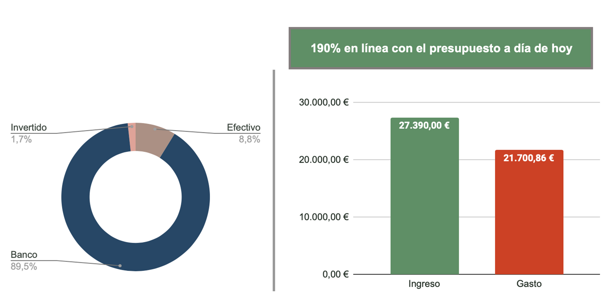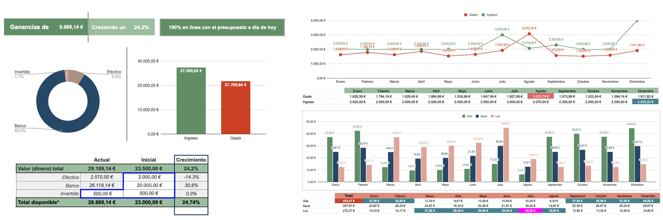Sabrás exactamente cuánto dinero tienes en efectivo, en el banco e incluso invertido en todo momento. Cuenta también con visión de tus gastos vs ingresos y porcentaje de cumplimiento de tu presupuesto de ahorro.